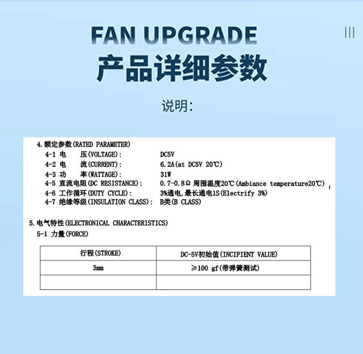 電壓: DC5V 行程:   電阻: 0.7~0.8 功率: 31W