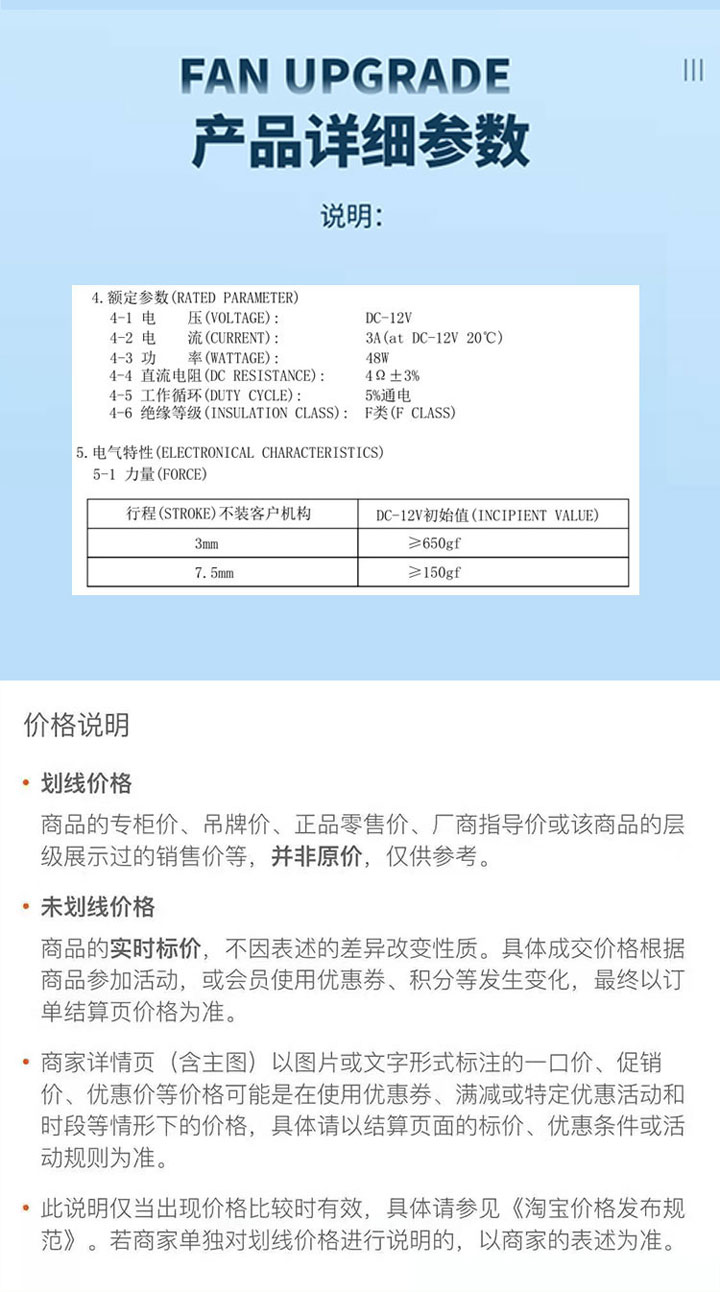 電壓: DC12V 行程: 3MM、7.5MM  電阻: 4歐 功率: 48W